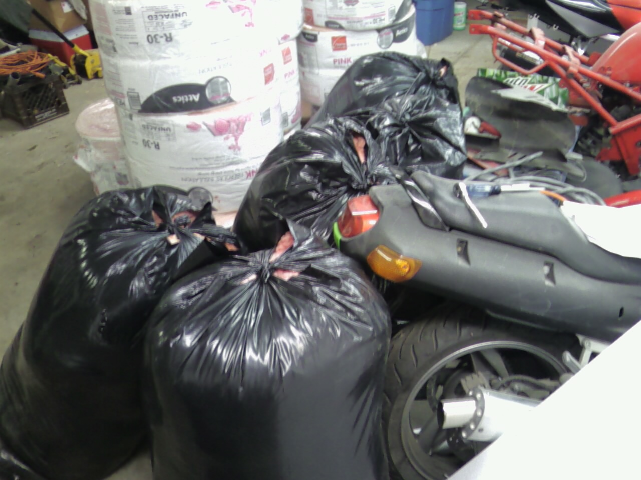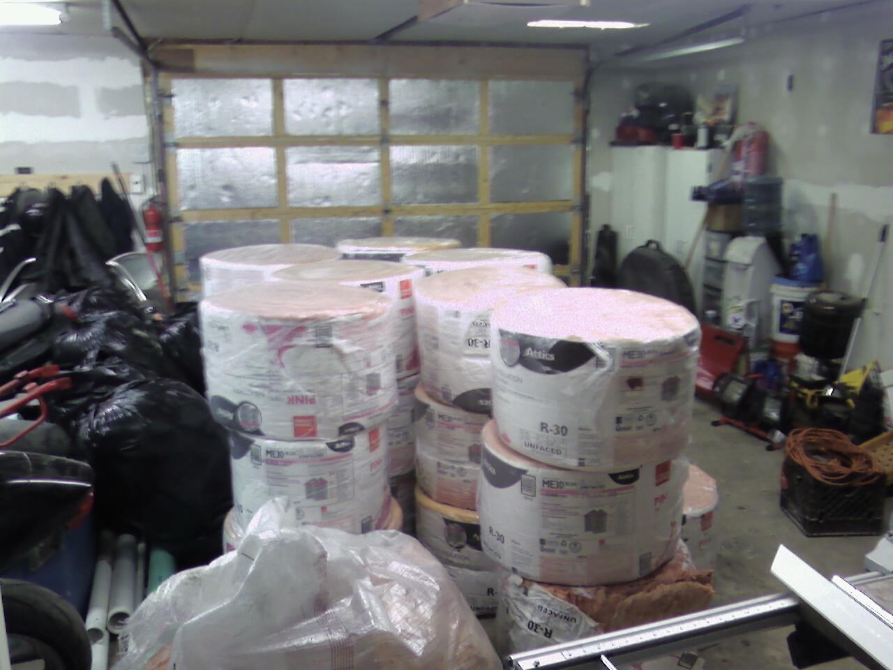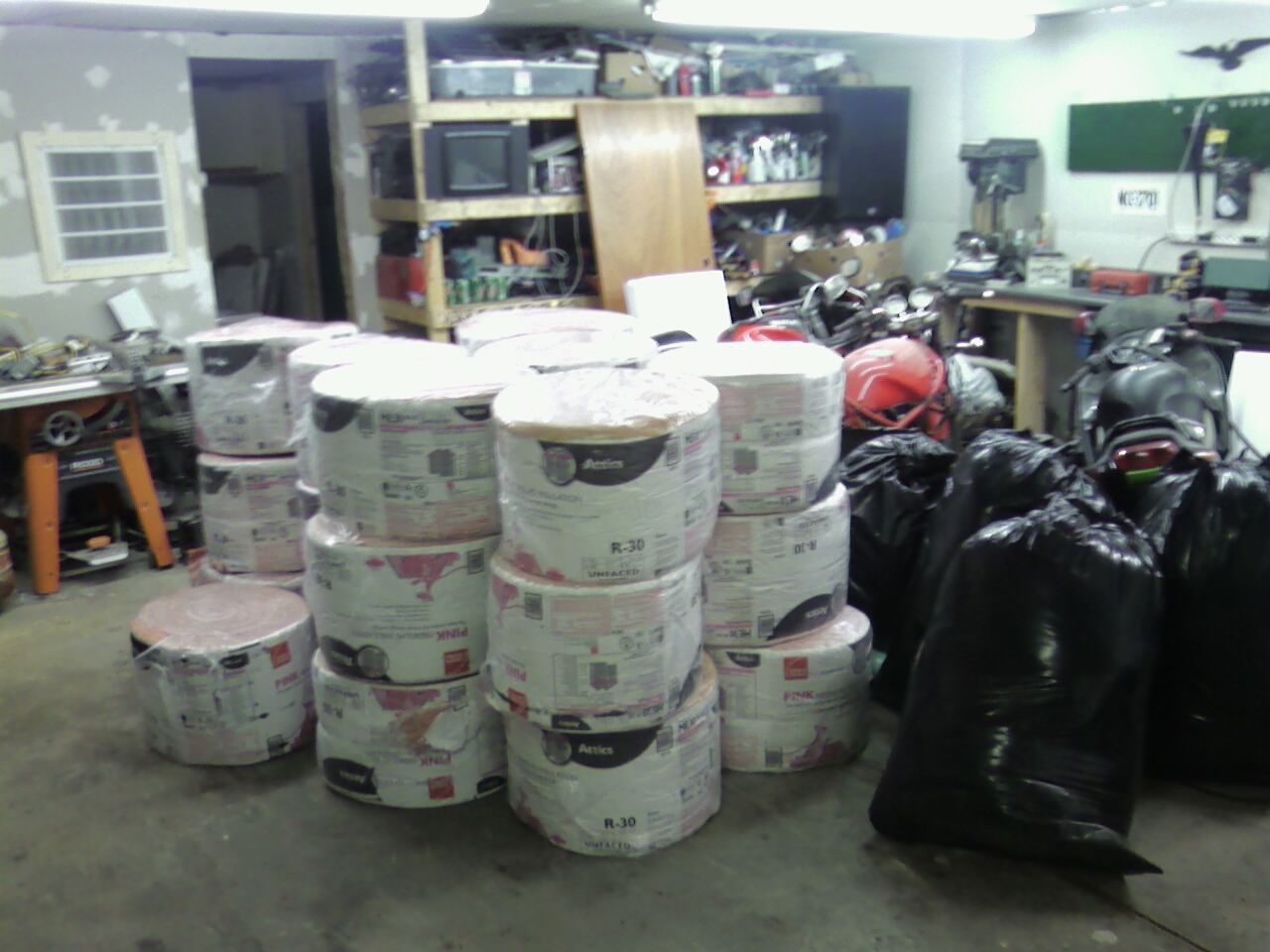 Craigslist rocks! A few days ago I found a guy with a bunch of R30 insulation he was looking to get rid of. Someone else was already coming to take it but he told me he would email me if the guy didn`t show. Well, he emailed me to let me know the guy took about half and I was welcome to the rest. Long story short, I got there and packed it all in garbage bags and crammed the car full. Wife, puppy, myself and a ton of insulation. That was the first lot. Thanks Dan!
